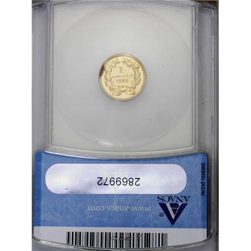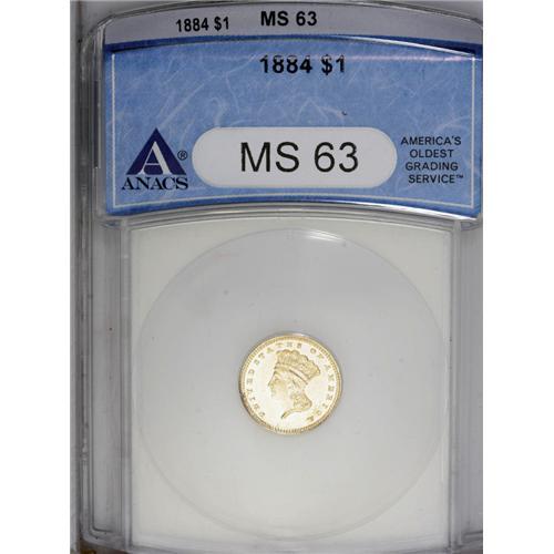 <B>1884<G$1> MS63 ANACS.</B></I> A flashy coin with rather reflective straw-gold surfaces that have a patch of magenta on the reverse at 10 o'clock. Sharply struck with light marks.