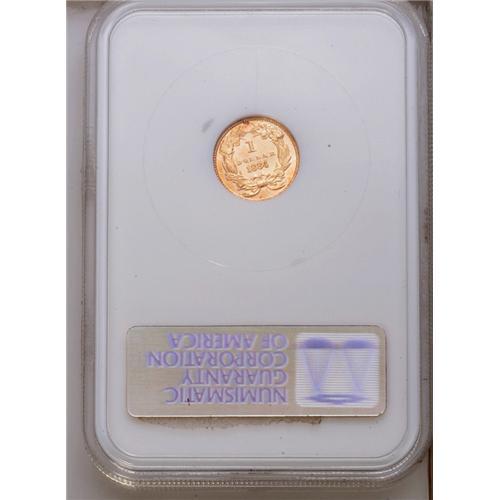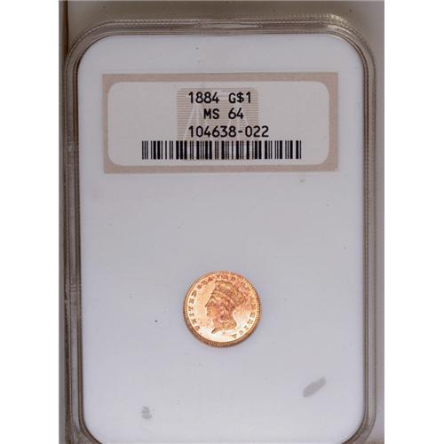 <B>1884<G$1> MS64 NGC.</B></I> A flashy yellow piece with strawberry-gold accents and a spot of red toning above the wreath. Reflective and nicely struck, with only light marks and a strike-through an unknown object beneath the bow on the reverse.