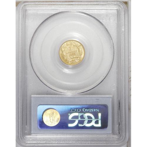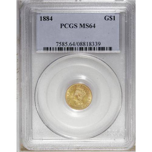 <B>1884 G$1 MS64 PCGS.</B></I> Choice and pleasing, this example comes from a late-date issue with a typically low mintage of 5,200 pieces. Impressively struck with lustrous and slightly reflective yellow-gold fields. Population: 37 in 64, 54 finer (9/06).<BR><BR><b>Shipping:</b> Coin/Currency (<a target="_blank" href="http://www.heritageauctions.com/common/shipping.php">view shipping information</a>)