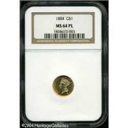 1884 G$1 MS64 Prooflike NGC. Well struck with incr <B>1884 G$1 MS64 Prooflike NGC.</B></I> Well struck with incredibly bright, frosty surfaces that seem pristine. The dark fields are highly reflective, and the yellow-golden devices are nicely frosted. Perhaps conservatively graded as a near-Gem. <BR><BR><B>Important notice:</B> Heritage usually auctions material at the rate of 200-250 lots per hour. On some occasions eBay Live bid software or the Internet may not be able to keep up with the pace of the auction. We recommend placing a realistic absentee bid now as insurance to avoid disappointment. Occasionally the auctioneer may eliminate or reject an eBay Live bid, and the auctioneer may also reopen a lot after the close of the eBay live bidding (usually because we missed an audience bid), and may reject your bid even if it shows you as the winning bidder. By bidding via eBay Live, you agree that Heritage may award the lot to another bidder at its sole discretion under the circumstances described above or any other reasonable circumstances. Since eBay bids are not shown to us until we open the lot on the floor, we treat those bids just like floor bids. In most cases the floor responds before the eBay bid is presented to us, due to Internet lag time, so for consistency we have made it a policy that floor bids are always considered first over tie eBay live bids. Also please note that all Heritage lots purchased through eBay Live carry a 20% Buyer's Premium. Please make sure you read the Terms and Conditions before you bid. This lot is being auctioned in conjunction with a live floor auction by Heritage Galleries & Auctioneers. All final auction and invoice information will be supplied by Heritage Galleries & Auctioneers, and all other information should be considered preliminary. Lot:6477