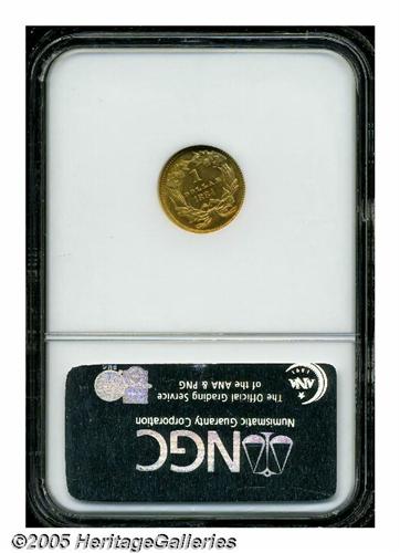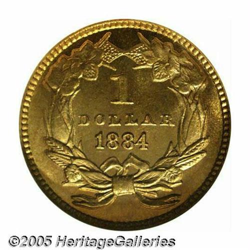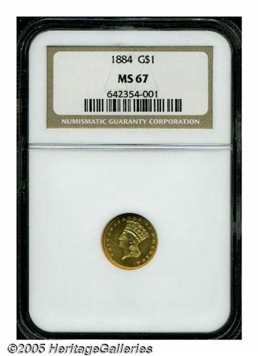<B>1884<G$1> MS67 NGC.</B></I> The 1884 gold dollar had an impressively low mintage of only 5,230 business strikes with an astonishingly high production run of proofs with 1,006 pieces produced. This is a lovely, semi-prooflike coin that displays rich reddish patina over each side that is noticeably deeper around the margins. The surfaces are essentially flawless. Population: 10 in 67, 4 finer (5/05).