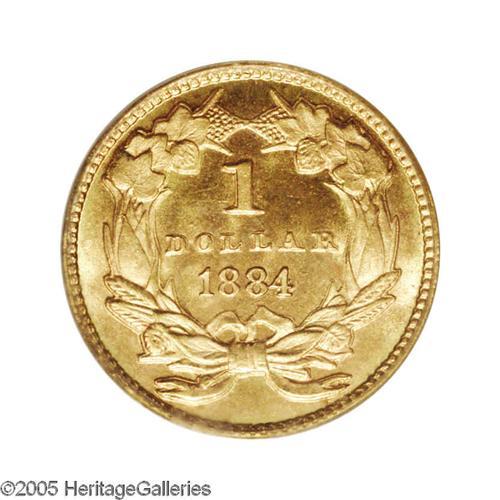 <B>1884<G$1> MS67 PCGS.</B></I> Only 5,230 business strikes of this issue were produced, along with 1,006 proofs. For whatever reason, the Gold Dollars of the 1880s were made as nicely as any coins ever minted by our government. This prooflike example is needle-sharp. A glittering, semi-reflective jewel that would be hard to improve upon at any price. A few clashmarks are seen on the obverse and reverse, but there are no handling marks or blemishes to be found. The bright surfaces have a completely untoned appearance. A marvelous Superb Gem, with exceptional eye appeal. Population: 11 in 67, 3 finer (10/05).