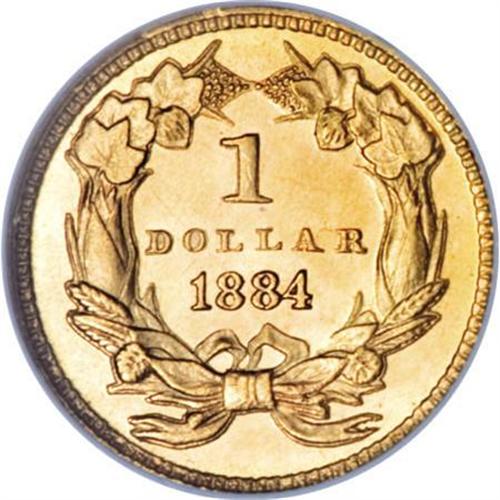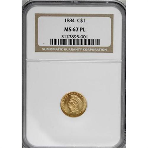 <B>1884 G$1 MS67 Prooflike NGC.</B></I> This is a fabulous Superb Gem with intensely prooflike fields and gorgeous champagne-red and mint-green coloration. The design elements are crisply struck, and there are no bothersome die clash marks on either side. A curly lint mark (as struck) resides between A and R in DOLLAR, near the center of the reverse. Census: 2 in 67 Prooflike, 0 finer in Prooflike condition (1/08). <BR><BR><B>Coin Engraver:</B> James B. Longacre<BR><BR><b>Shipping:</b> Coins & Currency (<a target="_blank" href="http://www.heritageauctions.com/common/shipping.php">view shipping information</a>)