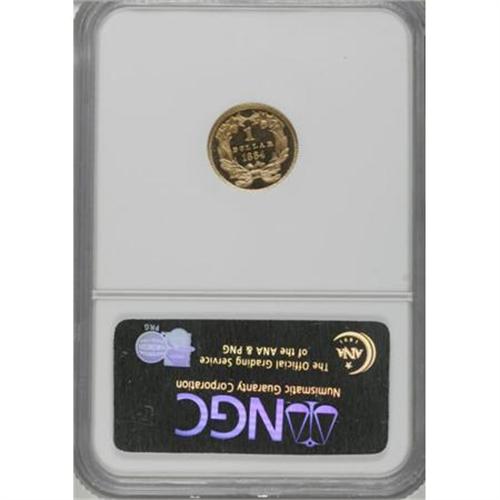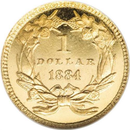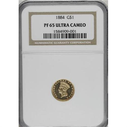 <B>1884 G$1 PR65 Ultra Cameo NGC.</B></I> Gold dollars from 1884 are easily found with reflective fields as a circulation strike. Proofs are also more available than in previous years, but they are not as plentiful as one might imagine from the mintage of 1,006 pieces. Apparently, quite a few proofs were used for jewelry purposes, which severely reduced the coins available for numismatists. The fields of this piece go "black" with unfathomable depth of reflectivity. Contrasted against this is the thick mint frost on the devices, which creates a stark, two-toned appearance. Close inspection reveals the orange-peel effect seen on many proof gold pieces from this era. A few tiny lint marks are scattered over each side, and there is a shallow flake in the obverse field below the chin of Liberty. <BR><BR><b>Shipping:</b> Coins & Currency (<a target="_blank" href="http://www.heritageauctions.com/common/shipping.php">view shipping information</a>)
