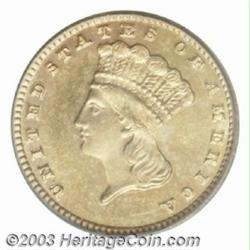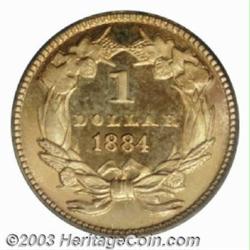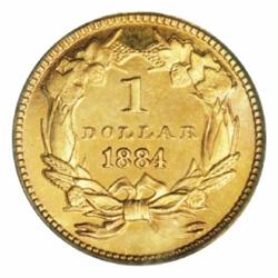 <table><tr><td><TABLE cellSpacing=0 cellPadding=0 width="100%" bgColor=#000000 border=0><TBODY> <TR><TD width="100%"><TABLE cellSpacing=1 cellPadding=3 width="100%" border=0><TBODY><TR><TD width="100%" bgColor=#79735c><FONT face=arial color=#ffffff size=3><B>Description</B> </FONT></TD></TR><TR><TD width="100%" bgColor=#ffffff><FONT face=arial size=2><B>1884 G$1 PR66 PCGS.</B></I> Ex: Bass Collection. This was the first year of greatly enhanced production of proofs, with 1,006 pieces struck in this format. Apparently many were used in the jewelry trade and attrition has taken a heavy toll on the original mintage. The current example is razor-sharp, and impressively preserved. A light milky haze is seen in the fields, but they remain fully reflective. The glassy surfaces are primarily a bright pumpkin-orange color, and no handling marks are to be found. Struck from the proof dies with the diagnostic doubling on the digits in the date. This coin was sold as part of the Harry W. Bass, Jr. Collection, in 1999, where it was identified as being of the sharply doubled date variety (Breen-6107), described by Walter Breen in his <I>Complete Encyclopedia of U.S. and Colonial Coins,</B></I>.<BR><I>Ex: Harry W. Bass, Jr. Collection (Bowers and Merena, 10/1999), lot 234, where it realized 10,350.00.</B></I> </FONT></TD></TR></TBODY></TABLE></TD></TR></TBODY></TABLE><BR><A name=PricesRealized></A><TABLE cellSpacing=0 cellPadding=0 width="100%" bgColor=#000000 border=0><TBODY><TR><TD width="100%"><TABLE cellSpacing=1 cellPadding=3 width="100%" border=0><TBODY><TR><TD width="100%" bgColor=#79735c><A name=PR><FONT face=arial color=#ffffff size=3><B>Previous Prices from Heritage Auctions</B> </FONT></A></TD></TR><TR><TD bgColor=#f6f6ed><TABLE cellSpacing=0 cellPadding=0 width="100%" border=1><TBODY><TR><TD align=middle width="33%"><B>Date</B></TD><TD align=middle width="33%"><B>Service</B></TD><TD align=middle width="33%"><B>Price</B></TD></TR><TR bgColor=whitesmoke><TD width="33%"><B>10/01/1999</B></TD><TD width="33%">PCGS</TD><TD width="33%">$10,350.00</TD></TR></TBODY></TABLE></TD></TR><TR><TD bgColor=#ffffff><FONT face=arial size=1 ?>PLEASE NOTE: All prices realized reflect the final hammer price PLUS the buyer's premium in auctions that charge a buyer's premium. Each item has a notation at the top of the listing indicating whether that lot included a buyer's premium. Example: A item that sells with a final hammer price of $100 and a 20% buyer's premium will display with a price realized of $120. All information listed is intended to be as accurate as possible, but errors are possible. Please use this guide carefully and inform us of any inaccuracies. </FONT></TD></TR></TBODY></TABLE></TD></TR></TBODY></TABLE><BR><TABLE cellSpacing=0 cellPadding=0 width="100%" bgColor=#000000 border=0><TBODY><TR><TD width="100%"><TABLE cellSpacing=1 cellPadding=3 width="100%" border=0><TBODY><TR><TD width="100%" bgColor=#79735c colSpan=6><FONT face=arial color=#ffffff size=3><B>Price Guide*</B> </FONT></TD></TR><TR bgColor=#f6f6ed><TD align=middle><B>Grade</B> </TD><TD align=middle><B>Coin World<BR>(Trends)</B> </TD><TD align=middle><B>Numismedia<BR>Retail</B> </TD><TD align=middle><B>Numismedia<BR>Wholesale</B> </TD><TD align=middle><B>Coin<BR>Universe</B> </TD><TD align=middle><B>Heritage<BR>Value Index</B> </TD></TR><TR bgColor=#ffffff><TD align=middle>65</TD><TD align=right>---</TD><TD align=right>---</TD><TD align=right>$7,550.00</TD><TD align=right>$9,500.00</TD><TD align=right>$6,741.67</TD></TR><TR style="FONT-WEIGHT: bold" bgColor=#cccfdd><TD align=middle>66</TD><TD align=right>---</TD><TD align=right>---</TD><TD align=right>$9,800.00</TD><TD align=right>$13,000.00</TD><TD align=right>$9,100.00</TD></TR><TR bgColor=#ffffff><TD align=middle>67</TD><TD align=right>---</TD><TD align=right>---</TD><TD align=right>$18,000.00</TD><TD align=right>$23,500.00</TD><TD align=right>$16,450.00</TD></TR><TR bgColor=#ffffff><TD colSpan=6><FONT size=1>*All information listed is intended to be as accurate as possible, but errors are possible. No item may be returned or refused based on this information which is provided as a service to our customers. You should contact each pricing source directly to determine the accuracy of this information. </FONT></TD></TR></TBODY></TABLE></TD></TR></TBODY></TABLE><BR><TABLE cellSpacing=0 cellPadding=0 width="100%" bgColor=#000000 border=0><TBODY><TR><TD width="100%"><TABLE cellSpacing=1 cellPadding=3 width="100%" border=0><TBODY><TR><TD width="100%" bgColor=#79735c><FONT face=arial color=#ffffff size=3><B>Population Guide</B> </FONT></TD></TR><TR bgColor=#ffffff><TD align=middle><!-- Begin Output of Population Grid--><TABLE cellSpacing=0 cellPadding=0 width="100%" border=0><TBODY><TR><TD vAlign=center><TABLE cellSpacing=0 width="100%" border=1 cellsadding="3"><TBODY><TR><TD vAlign=center><TABLE cellSpacing=0 cellPadding=3 width="100%" border=1><TBODY><TR><TD vAlign=center align=middle bgColor=#f0f1e8 colSpan=2 <CENTER><FONT face=Arial size=2><B>PCGS Pop </B></FONT><CENTER></CENTER></TD><TD vAlign=center align=middle bgColor=#f0f1e8 colSpan=2><CENTER><FONT face=Arial size=2><B>NGC Pop</B></CENTER></FONT></TD></TR><TR><TD vAlign=center><FONT face=Arial size=2>(66)</FONT> </TD><TD vAlign=center align=right><FONT face=Arial size=2>15</FONT> </TD><TD vAlign=center><FONT face=Arial size=2>(66)</FONT> </TD><TD vAlign=center align=right><FONT face=Arial size=2>0</FONT> </TD></TR><TR><TD vAlign=center><FONT face=Arial size=2>(>66)</FONT> </TD><TD vAlign=center align=right><FONT face=Arial size=2>6</FONT> </TD><TD vAlign=center><FONT face=Arial size=2>(>66)</FONT> </TD><TD vAlign=center align=right><FONT face=Arial size=2>0</FONT> </TD></TR></TBODY></TABLE></TD></TR></TBODY></TABLE></TD></TR></TBODY></TABLE><!-- End Output of Population Grid--></TD></TR></TBODY></TABLE></TD></TR></TBODY></TABLE><BR><TABLE cellSpacing=0 cellPadding=0 width="100%" bgColor=#000000 border=0><TBODY><TR> Important notic