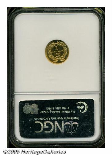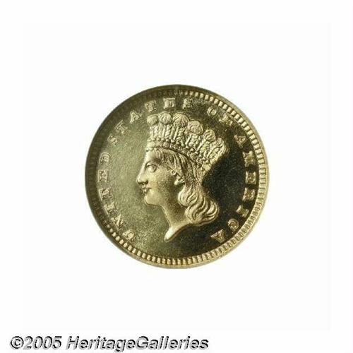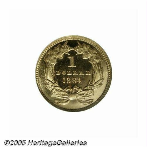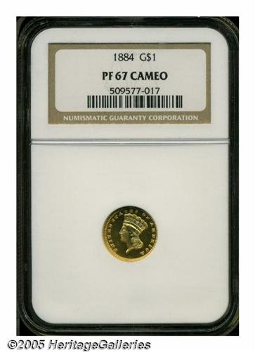 <B>1884<G$1> PR67 Cameo NGC.</B></I> Doubled Date. Breen-6107. The Mint's production of proof Gold Dollars ratcheted up to 1,006 pieces in 1884 from only 207 coins the previous year. Although the former mintage figure suggests that the 1884 is an easily obtainable issue, nothing could be farther from the truth. In fact, we believe that no more than 50 examples of this issue are extant, the majority of which grade below the PR66 level. The deep fields appear to swallow all light, a feature that presents an exquisite backdrop to the frosty devices. The color is rich yellow-gold in shade and there are no mentionable marks. The date displays dramatic doubling under a loupe. Population: 7 in 67 Cameo, 1 finer (5/05).