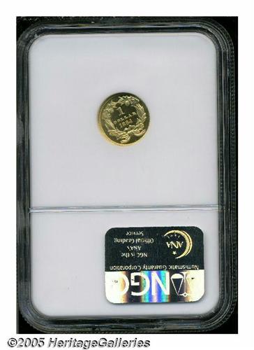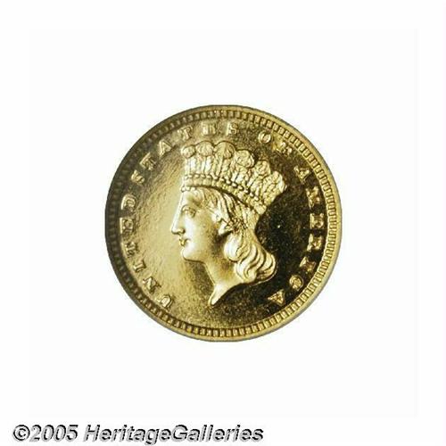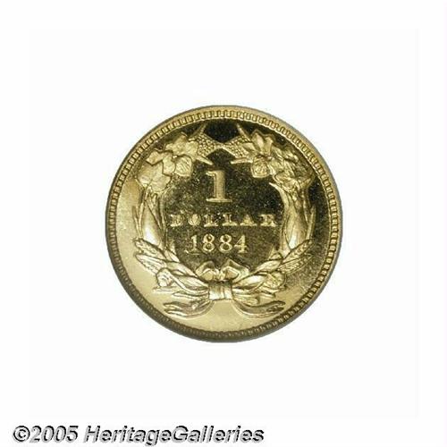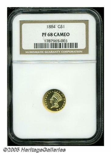<B>1884<G$1> PR68 Cameo NGC.</B></I> Doubled Date. Breen-6107. The date displays dramatic doubling under a loupe. The mint's production of proof Gold Dollars dramatically rose to 1,006 pieces in 1884 from only 207 coins the previous year. Although the former mintage figure suggests that the 1884 is an easily obtainable issue, nothing could be farther from the truth. In fact, we believe that no more than 50 examples of this issue are extant, the majority of which grade below the PR65 level.<BR> This piece exhibits bright, yellow-gold luster on sparkling, deeply mirrored fields. Close examination reveals an "orange peel" texture and there are no post-striking distractions. The only possible identifier is a microscopic lintmark to the left of the base of the 1 in the date. A very special offering for the gold enthusiast.