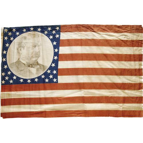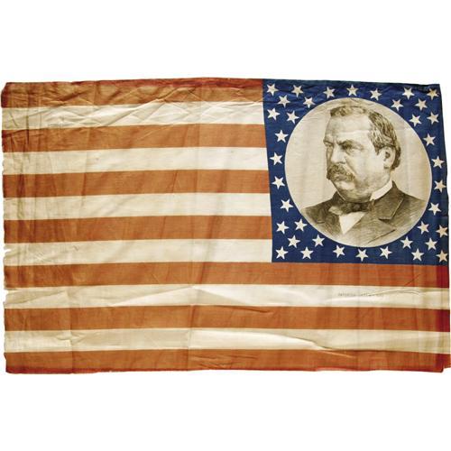 <B>Fine, Large 1884 Grover Cleveland Cotton Cloth Campaign Flag.</B></I> Although Cleveland ran three times, this flag can be dated to his first run, because companion pieces were made for his running mate, Thomas Hendricks, as well as his opponent, James G. Blaine. Condition is outstanding: the fabric itself is crisp and fresh, the colors vibrant. A couple of utterly trivial tiny tears detract not at all. There is the slightest hint of age browning above Cleveland's head, which blends in nicely. Very minor pieces missing at two corners, really inconsequential. Overall, one of the finest examples we have seen. 17.5" x 26.5".