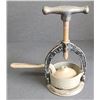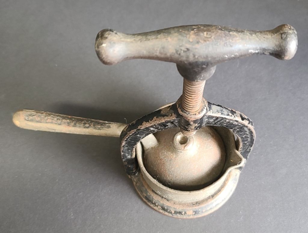 1884 Cast Iron H.F. Osborne Meat and Juice press 3 piece Cast Iron set with rust damage. Parts include Corkscrew press and removable top long handled press and removable double sided bottom mold- one side is a juicecup,other side is a meat mold. Measurements listed are for assembled full piece (8 1/2'H*8'W*4'D)8 1/2'H*8'W*4'D
