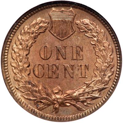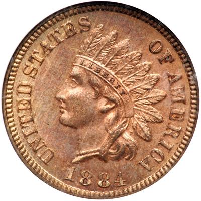 1884 Indian Head Cent. NGC graded Proof 66 Red. Starting to tone. As you work your way through the box of Indian cents at Lot Viewing, we're sure as anything your gaze will come to a halt before this gleaming Red gem. It lies within sniffing distance of MS67 inasmuch as it has razor-sharpness even the most critical buyer would be envious of in a Proof Indian cent. Pop 13; 4 in 67 Red.