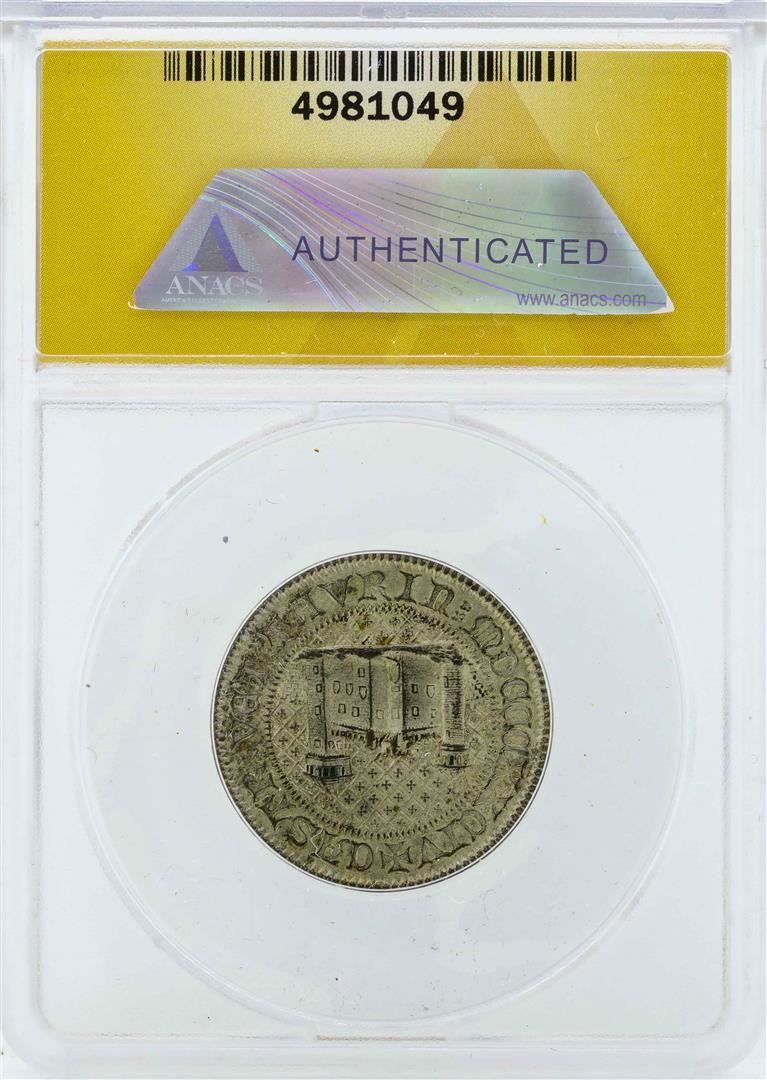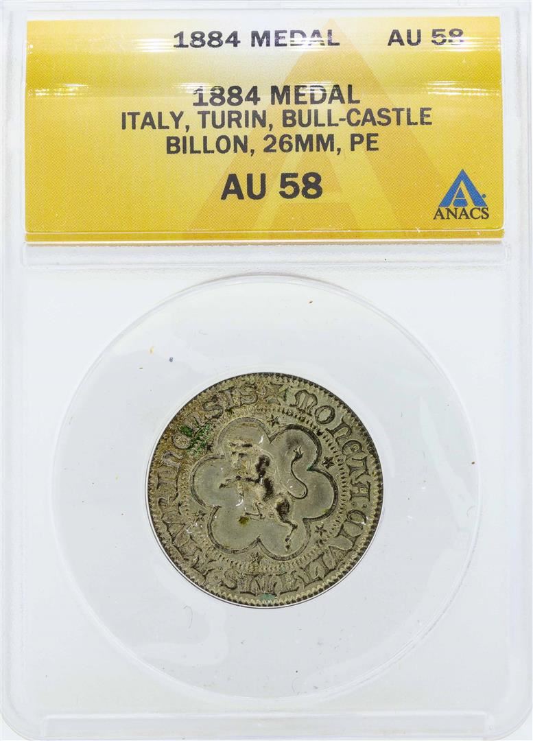 One 1884 Italy Turin Bull Castle Medal ANACS AU58. ANACS Appraised.