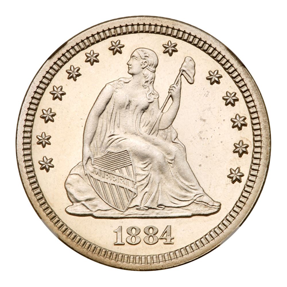 1884. NGC graded Proof 67. Fully white and boldly struck. Sure looks like a Cameo Proof with considerable contrast between the mirror fields and frosted devices. Completely bold on each and every device, and the surfaces are virtually perfect in their preservation. Scarce as a date, especially so in superb condition. A phenomenal gem! Only 875 struck. Pop 19; 2 finer, 1 in 68, 1 in 69. Estimated Value 3,700 - 3,900