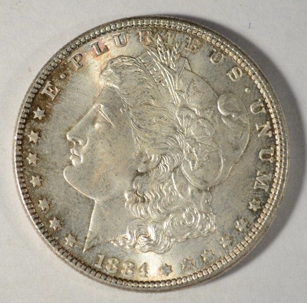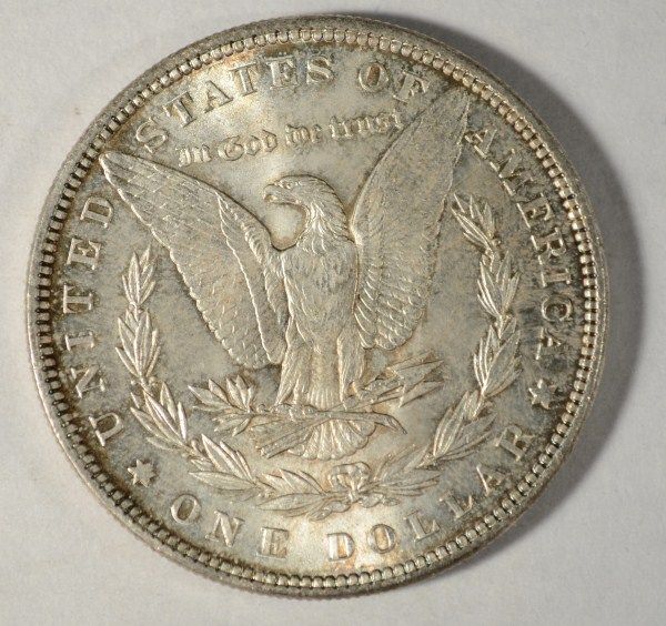 THIS IS A VERY NICE MORGAN DOLLAR WITH A LITTLE TONING AROUND THE PERIMETER, EST. $75.00 TO $85.00