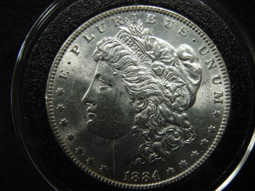 1884 U.S. MORGAN SILVER DOLLAR. Coin is in circular case.