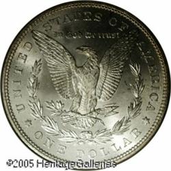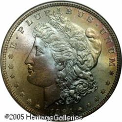 <B>1884<img border='0' src='http://www.heritagecoins.com/images/star.gif' width=10 height=10>$1 MS67 <img border='0' src='http://www.heritagecoins.com/images/star.gif' width=10 height=10> NGC.</B></I> This issue is readily obtainable in all grades up to and including MS65. It becomes quite difficult at the MS67 level, and even more so with the star designation. Indeed, NGC has certified only two coins at MS67 with the coveted <img border='0' src='http://www.heritagecoins.com/images/star.gif' width=10 height=10>, with none finer (1/05). The obverse of this piece displays gorgeous iridescent powder-blue, pale-purple, gold, and crimson toning on the obverse, with an essentially brilliant reverse. The lustrous surfaces are immaculately preserved, showing no mentionable abrasions. The design elements are sharply struck, with just a faint touch of softness in the hair above Liberty's ear. A super coin with super eye appeal. Lot:10141