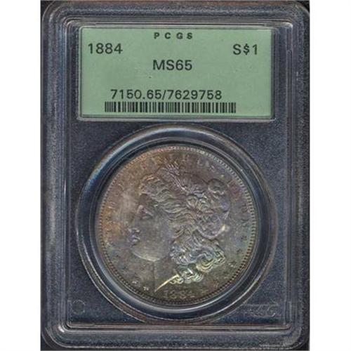 <b>1884 Morgan Dollar. PCGS graded MS65.</b> Delicious purple and deep steel blue iridescence covers the entire obverse in a nice blanket of color while the reverse has a brighter hue, although it too is toned <b>(PCGS # 7150)</b>