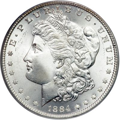 1884 Morgan Dollar. PCGS graded MS-66. A nice frosty white coin displaying full cartwheel effect. The luster is bright enough to concentrate everyone's mind on its purity and fresh-off-the-dies look (PCGS # 7150).