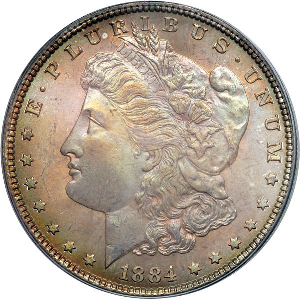 1884. PCGS graded MS-66 CAC Approved. Nice even subdued multi-color toning on both sides; bold frostiness everywhere (PCGS # 7150) .