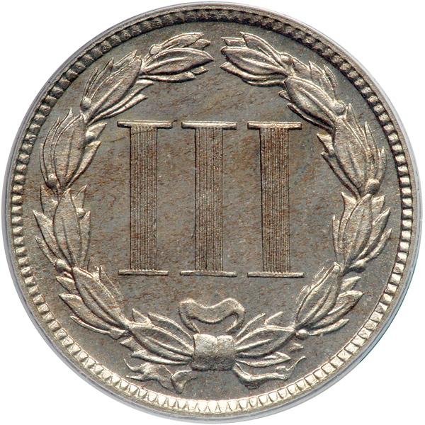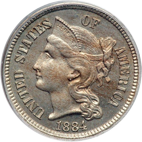 1884 Nickel Three Cents. PCGS graded Proof 64. Light even toning, a sharply made Proof. Low mintage year (PCGS # 3780) .