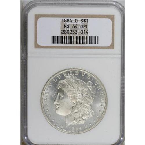 <B>1884-O $1 MS64 Deep Mirror Prooflike NGC.</B></I> NGC Census: (525/124). PCGS Population (630/268). Numismedia Wsl. Price for NGC/PCGS coin in MS64: $275. (#97155)<BR><BR><b>Shipping:</b> Coins & Currency (<a target="_blank" href="http://www.heritageauctions.com/common/shipping.php">view shipping information</a>)