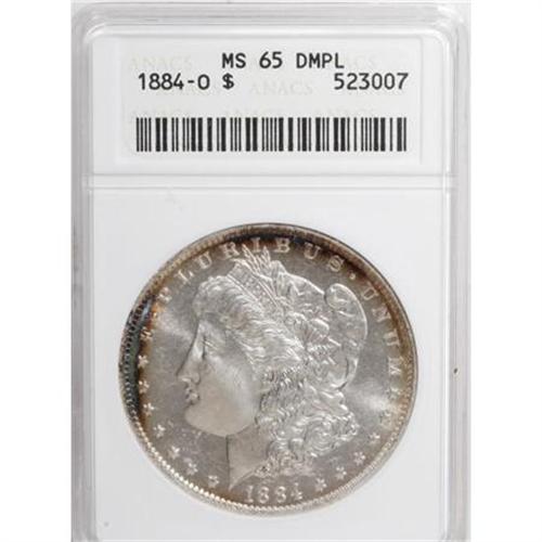 <B>1884-O $1 MS65 Deep Mirror Prooflike ANACS.</B></I> NGC Census: (114/11). PCGS Population (218/50). Numismedia Wsl. Price for NGC/PCGS coin in MS65: $630. (#97155)<BR><BR><b>Shipping:</b> Coins & Currency (<a target="_blank" href="http://www.heritageauctions.com/common/shipping.php">view shipping information</a>)