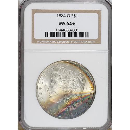 <B>1884-O $1 MS64<img border='0' src='http://www.heritagecoins.com/images/star.gif' width=10 height=10> NGC.</B></I> NGC Census: (56091/14006). PCGS Population (42355/11106). Mintage: 9,730,000. Numismedia Wsl. Price: $46. (#7154)<BR><BR><b>Shipping:</b> Coins & Currency (<a target="_blank" href="http://www.heritageauctions.com/common/shipping.php">view shipping information</a>)