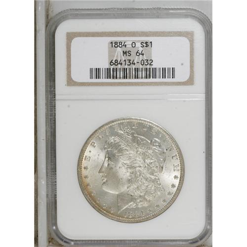 <B>1884-O $1 MS64 NGC.</B></I> NGC Census: (56091/14006). PCGS Population (42355/11106). Mintage: 9,730,000. Numismedia Wsl. Price: $46. (#7154)<BR><BR><b>Shipping:</b> Coins & Currency (<a target="_blank" href="http://www.heritageauctions.com/common/shipping.php">view shipping information</a>)