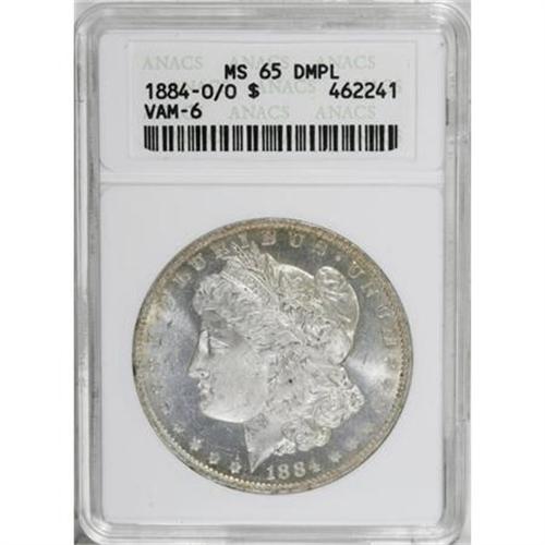 <B>1884-O/O $1 MS65 Deep Mirror Prooflike ANACS.</B></I> VAM-6. A Top 100 Variety. Golden-brown and sea-green toning adorns the margins of this crisply struck and carefully preserved New Orleans dollar. The fields are flashy, and contrast with the icy devices.<BR><BR><b>Shipping:</b> Coins & Currency (<a target="_blank" href="http://www.heritageauctions.com/common/shipping.php">view shipping information</a>)