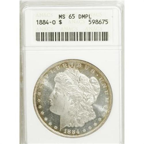 <B>1884-O $1 MS65 Deep Mirror Prooflike ANACS.</B></I> Bowers (1993) opines that an estimated 15,000 PL examples of this New Orleans issue exist, and around the same number of DMPL coins. About 10 percent of these, he says, are MS65 or better. This may sound like a lot, but, considering that millions survive in Mint State, this actually seems like a relatively small number. This gorgeous example is well struck and presents a lovely original appearance which includes russet and gold border toning. The fields are glassy and highly reflective, and the central devices show pleasing mint frost. <BR><BR><b>Shipping:</b> Coins & Currency (<a target="_blank" href="http://www.heritageauctions.com/common/shipping.php">view shipping information</a>)