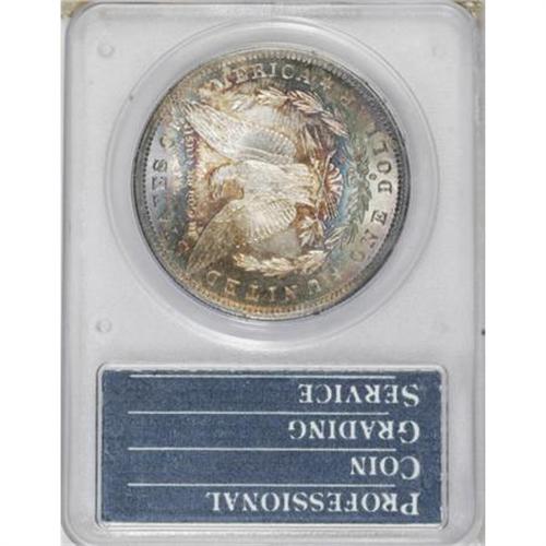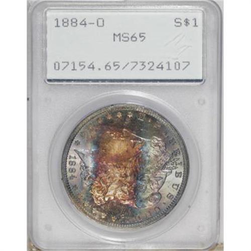<B>1884-O $1 MS65 PCGS.</B></I> Rainbow bands of ice-blue and crimson-yellow cross both sides of this pretty Gem, housed in a small-size first-generation PCGS holder.<BR><BR><B>Coin Engraver:</B> George T. Morgan<BR><BR><b>Shipping:</b> Coins & Currency (<a target="_blank" href="http://www.heritageauctions.com/common/shipping.php">view shipping information</a>)