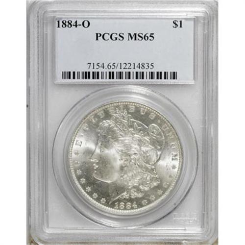 <B>1884-O $1 MS65 PCGS.</B></I> . PCGS Population (10411/1052). NGC Census: (13341/1465). Mintage: 9,730,000. Numismedia Wsl. Price for NGC/PCGS coin in MS65: $122. (#7154)<BR><BR><B>Coin Engraver:</B> George T. Morgan<BR><BR><b>Shipping:</b> Coins & Currency (<a target="_blank" href="http://www.heritageauctions.com/common/shipping.php">view shipping information</a>)