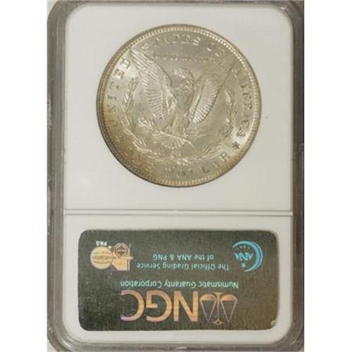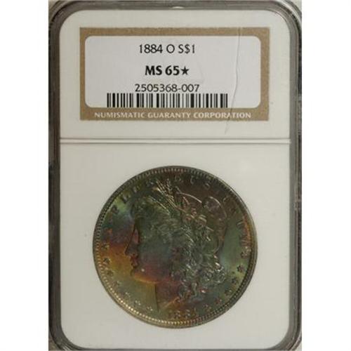 <B>1884-O $1 MS65 <img border='0' src='http://www.heritagecoins.com/images/star.gif' width=10 height=10> NGC.</B></I> Ruby-red, forest-green, and peach adorn the obverse of this lustrous example. The reverse margin has a hint of gold and sky-blue toning. The left obverse has a few light marks.<BR><BR><B>Coin Engraver:</B> George T. Morgan<BR><BR><b>Shipping:</b> Coins & Currency (<a target="_blank" href="http://www.heritageauctions.com/common/shipping.php">view shipping information</a>)