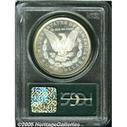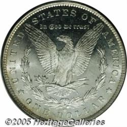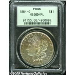 <B>1884-O<img border='0' src='http://www.heritagecoins.com/images/star.gif' width=10 height=10>$1 MS66 Deep Mirror Prooflike PCGS.</B></I> This date is readily available through MS65, with specimens above that level becoming more difficult to obtain. The MS66 we offer here reveals low intensity multicolored toning on the obverse, while the reverse shows just a touch of light color at the margins. The design elements are generally well struck, though the hair over Liberty's ear is a touch soft, and the surfaces are generally well preserved. Population: 47 in 66 DMPL, 1 finer (2/05).