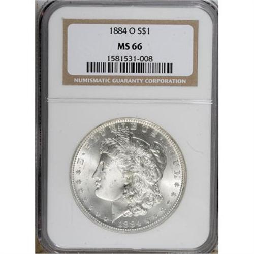 <B>1884-O $1 MS66 NGC.</B></I> NGC Census: (1322/73). PCGS Population (940/54). Mintage: 9,730,000. Numismedia Wsl. Price for NGC/PCGS coin in MS66: $300. (#7154)<BR><BR><b>Shipping:</b> Coins & Currency (<a target="_blank" href="http://www.heritageauctions.com/common/shipping.php">view shipping information</a>)