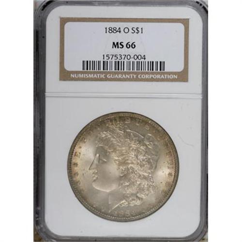 <B>1884-O $1 MS66 NGC.</B></I> NGC Census: (1328/73). PCGS Population (940/54). Mintage: 9,730,000. Numismedia Wsl. Price for NGC/PCGS coin in MS66: $300. (#7154)<BR><BR><B>Coin Engraver:</B> George T. Morgan<BR><BR><b>Shipping:</b> Coins & Currency (<a target="_blank" href="http://www.heritageauctions.com/common/shipping.php">view shipping information</a>\)