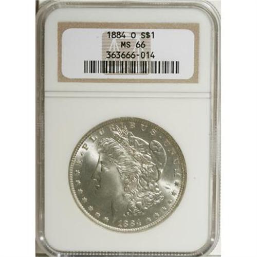 <B>1884-O $1 MS66 NGC.</B></I> NGC Census: (1344/73). PCGS Population (985/54). Mintage: 9,730,000. Numismedia Wsl. Price for NGC/PCGS coin in MS66: $300. (#7154)<BR><BR><B>Coin Engraver:</B> George T. Morgan<BR><BR><b>Shipping:</b> Coins & Currency (<a target="_blank" href="http://www.heritageauctions.com/common/shipping.php">view shipping information</a>)