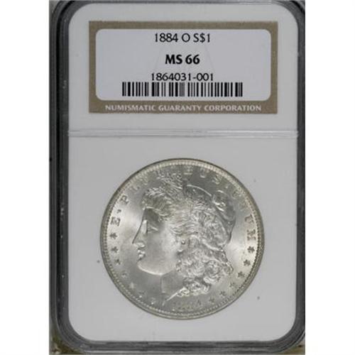 <B>1884-O $1 MS66 NGC.</B></I> . NGC Census: (1392/74). PCGS Population (999/54). Mintage: 9,730,000. Numismedia Wsl. Price for NGC/PCGS coin in MS66: $300. (#7154)<BR><BR><B>Coin Engraver:</B> George T. Morgan<BR><BR><b>Shipping:</b> Coins & Currency (<a target="_blank" href="http://www.heritageauctions.com/common/shipping.php">view shipping information</a>)