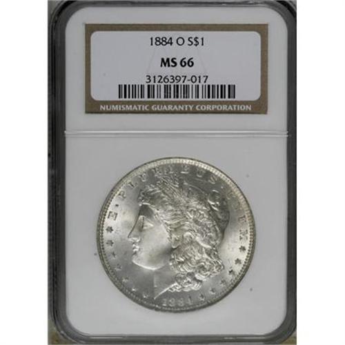 <B>1884-O $1 MS66 NGC.</B></I> NGC Census: (1400/74). PCGS Population (1012/54). Mintage: 9,730,000. Numismedia Wsl. Price for NGC/PCGS coin in MS66: $300. (#7154)<BR><BR><B>Coin Engraver:</B> George T. Morgan<BR><BR><b>Shipping:</b> Coins & Currency (<a target="_blank" href="http://www.heritageauctions.com/common/shipping.php">view shipping information</a>)