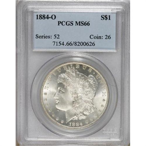 <B>1884-O $1 MS66 PCGS.</B></I> PCGS Population (940/54). NGC Census: (1322/73). Mintage: 9,730,000. Numismedia Wsl. Price for NGC/PCGS coin in MS66: $300. (#7154)<BR><BR><b>Shipping:</b> Coins & Currency (<a target="_blank" href="http://www.heritageauctions.com/common/shipping.php">view shipping information</a>)