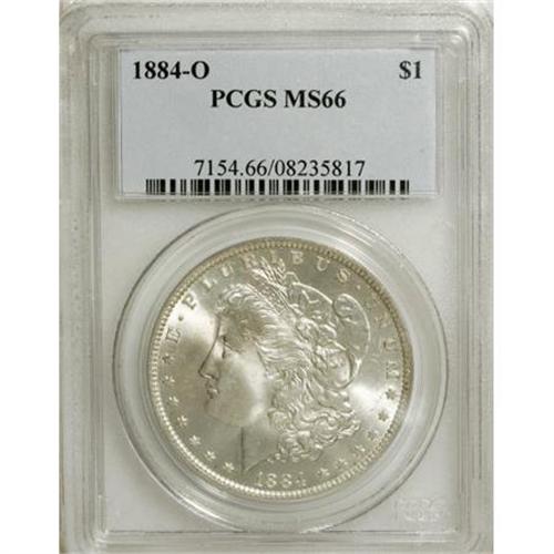 <B>1884-O $1 MS66 PCGS.</B></I> PCGS Population (940/54). NGC Census: (1315/73). Mintage: 9,730,000. Numismedia Wsl. Price for NGC/PCGS coin in MS66: $300. (#7154)<BR><BR><b>Shipping:</b> Coins & Currency (<a target="_blank" href="http://www.heritageauctions.com/common/shipping.php">view shipping information</a>)
