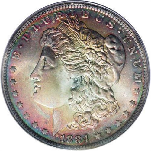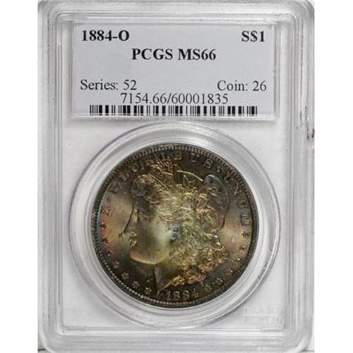 <B>1884-O $1 MS66 PCGS.</B></I> The mintmark is lightly repunched within the loop. The obverse is blanketed by beautifully deep olive, violet, and electric-blue coloration, while the reverse shows a ring of sea-green and tan. Lustrous, well struck, and immaculately preserved. Struck from lightly clashed dies. <BR><BR><B>Coin Engraver:</B> George T. Morgan<BR><BR><b>Shipping:</b> Coins & Currency (<a target="_blank" href="http://www.heritageauctions.com/common/shipping.php">view shipping information</a>)