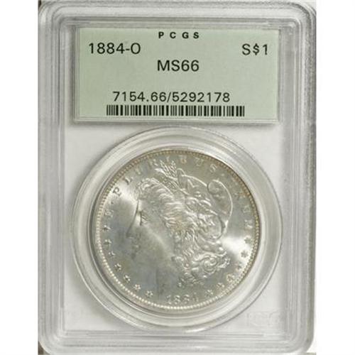 <B>1884-O $1 MS66 PCGS.</B></I> PCGS Population (985/54). NGC Census: (1344/73). Mintage: 9,730,000. Numismedia Wsl. Price for NGC/PCGS coin in MS66: $300. (#7154)<BR><BR><B>Coin Engraver:</B> George T. Morgan<BR><BR><b>Shipping:</b> Coins & Currency (<a target="_blank" href="http://www.heritageauctions.com/common/shipping.php">view shipping information</a>)