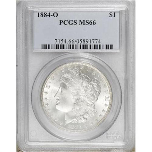 <B>1884-O $1 MS66 PCGS.</B></I> PCGS Population (987/54). NGC Census: (1373/74). Mintage: 9,730,000. Numismedia Wsl. Price for NGC/PCGS coin in MS66: $300. (#7154)<BR><BR><B>Coin Engraver:</B> George T. Morgan<BR><BR><b>Shipping:</b> Coins & Currency (<a target="_blank" href="http://www.heritageauctions.com/common/shipping.php">view shipping information</a>)