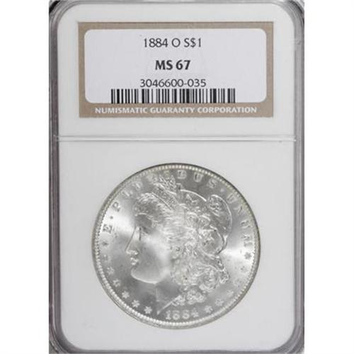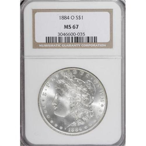 <B>1884-O $1 MS67 NGC.</B></I> Although the hair over Liberty's ear is typically weak, all other design features on both sides are boldly defined. The frosty white-silver surfaces are fully brilliant and highly lustrous. This is an excellent example of the date, qualifying in a tie for the finest certified by NGC. Census: 73 in 67, 0 finer (6/07).<BR><BR><b>Shipping:</b> Coins & Currency (<a target="_blank" href="http://www.heritageauctions.com/common/shipping.php">view shipping information</a>)