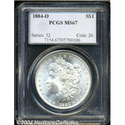 <table><tbody><tr><td><table> <TR><TD width="100%"><TABLE cellSpacing=1 cellPadding=3 width="100%" border=0><TBODY><TR><TD width="100%" bgColor=#79735c><FONT face=arial color=#ffffff size=3><B>Description</B> </FONT></TD></TR><TR><TD width="100%" bgColor=#ffffff><FONT face=arial size=2><B>1884-O $1 MS67 PCGS.</B></I> Not only is this sterling O-mint representative endowed with strong definition and impeccably smooth, untoned surfaces, but the satiny luster has an especially vibrant finish. Population: 44 in 67, 1 finer (10/03).<BR><I>From the Dylan Elijah Collection of Morgan Dollars; Ex: R. Dier Collection.</B></I> </FONT></TD></TR></TBODY></TABLE></TD></TR></TBODY></TABLE><BR><A name=PricesRealized></A><TABLE cellSpacing=0 cellPadding=0 width="100%" bgColor=#000000 border=0><TBODY><TR><TD width="100%"><TABLE cellSpacing=1 cellPadding=3 width="100%" border=0><TBODY><TR><TD width="100%" bgColor=#79735c><A name=PR><FONT face=arial color=#ffffff size=3><B>Previous Prices from Heritage Auctions</B> </FONT></A></TD></TR><TR><TD bgColor=#f6f6ed><TABLE cellSpacing=0 cellPadding=0 width="100%" border=1><TBODY><TR><TD align=middle width="33%"><B>Date</B></TD><TD align=middle width="33%"><B>Service</B></TD><TD align=middle width="33%"><B>Price</B></TD></TR><TR bgColor=whitesmoke><TD width="33%"><B>03/01/2003</B></TD><TD width="33%">PCGS</TD><TD width="33%">$3,220.00</TD></TR><TR bgColor=whitesmoke><TD width="33%"><B>08/08/2001</B></TD><TD width="33%">PCGS</TD><TD width="33%">$3,680.00</TD></TR><TR bgColor=whitesmoke><TD width="33%"><B>01/07/2000</B></TD><TD width="33%">PCGS</TD><TD width="33%">$3,335.00</TD></TR><TR bgColor=whitesmoke><TD width="33%"><B>03/21/1998</B></TD><TD width="33%">PCGS</TD><TD width="33%">$3,220.00</TD></TR><TR bgColor=whitesmoke><TD width="33%"><B>08/17/1996</B></TD><TD width="33%">NGC</TD><TD width="33%">$3,080.00</TD></TR><TR bgColor=whitesmoke><TD width="33%"><B>05/01/2001</B></TD><TD width="33%">PCGS</TD><TD width="33%">$2,530.00</TD></TR><TR bgColor=whitesmoke><TD width="33%"><B>02/01/1998</B></TD><TD width="33%">PCGS</TD><TD width="33%">$5,060.00</TD></TR><TR bgColor=whitesmoke><TD width="33%"><B>09/01/1999</B></TD><TD width="33%">PCGS</TD><TD width="33%">$1,783.00</TD></TR><TR bgColor=whitesmoke><TD width="33%"><B>01/01/1999</B></TD><TD width="33%">PCGS</TD><TD width="33%">$3,220.00</TD></TR></TBODY></TABLE></TD></TR><TR><TD bgColor=#ffffff><FONT face=arial size=1 ?>PLEASE NOTE: All prices realized reflect the final hammer price PLUS the buyer's premium in auctions that charge a buyer's premium. Each item has a notation at the top of the listing indicating whether that lot included a buyer's premium. Example: A item that sells with a final hammer price of $100 and a 20% buyer's premium will display with a price realized of $120. All information listed is intended to be as accurate as possible, but errors are possible. Please use this guide carefully and inform us of any inaccuracies. </FONT></TD></TR></TBODY></TABLE></TD></TR></TBODY></TABLE><BR><TABLE cellSpacing=0 cellPadding=0 width="100%" bgColor=#000000 border=0><TBODY><TR><TD width="100%"><TABLE cellSpacing=1 cellPadding=3 width="100%" border=0><TBODY><TR><TD width="100%" bgColor=#79735c colSpan=6><FONT face=arial color=#ffffff size=3><B>Price Guide*</B> </FONT></TD></TR><TR bgColor=#f6f6ed><TD align=middle><B>Grade</B> </TD><TD align=middle><B>Coin World<BR>(Trends)</B> </TD><TD align=middle><B>Numismedia<BR>Retail</B> </TD><TD align=middle><B>Numismedia<BR>Wholesale</B> </TD><TD align=middle><B>Coin<BR>Universe</B> </TD><TD align=middle><B>Heritage<BR>Value Index</B> </TD></TR><TR bgColor=#ffffff><TD align=middle>66</TD><TD align=right>$300.00</TD><TD align=right>$275.00</TD><TD align=right>$220.00</TD><TD align=right>$325.00</TD><TD align=right>$235.00</TD></TR><TR style="FONT-WEIGHT: bold" bgColor=#cccfdd><TD align=middle>67</TD><TD align=right>---</TD><TD align=right>---</TD><TD align=right>$3,475.00</TD><TD align=right>$4,000.00</TD><TD align=right>$3,250.00</TD></TR><TR bgColor=#ffffff><TD align=middle>68</TD><TD align=right>---</TD><TD align=right>---</TD><TD align=right>---</TD><TD align=right>$12,500.00</TD><TD align=right>---</TD></TR><TR bgColor=#ffffff><TD colSpan=6><FONT size=1>*All information listed is intended to be as accurate as possible, but errors are possible. No item may be returned or refused based on this information which is provided as a service to our customers. You should contact each pricing source directly to determine the accuracy of this information. </FONT></TD></TR></TBODY></TABLE></TD></TR></TBODY></TABLE><BR><TABLE cellSpacing=0 cellPadding=0 width="100%" bgColor=#000000 border=0><TBODY><TR><TD width="100%"><TABLE cellSpacing=1 cellPadding=3 width="100%" border=0><TBODY><TR><TD width="100%" bgColor=#79735c><FONT face=arial color=#ffffff size=3><B>Population Guide</B> </FONT></TD></TR><TR bgColor=#ffffff><TD align=middle><!-- Begin Output of Population Grid--><TABLE cellSpacing=0 cellPadding=0 width="100%" border=0><TBODY><TR><TD vAlign=center><TABLE cellSpacing=0 width="100%" border=1 cellsadding="3"><TBODY><TR><TD vAlign=center><TABLE cellSpacing=0 cellPadding=3 width="100%" border=1><TBODY><TR><TD vAlign=center align=middle bgColor=#f0f1e8 colSpan=2 <CENTER><FONT face=Arial size=2><B>PCGS Pop </B></FONT><CENTER></CENTER></TD><TD vAlign=center align=middle bgColor=#f0f1e8 colSpan=2><CENTER><FONT face=Arial size=2><B>NGC Pop</B></CENTER></FONT></TD></TR><TR><TD vAlign=center><FONT face=Arial size=2>(67)</FONT> </TD><TD vAlign=center align=right><FONT face=Arial size=2>44</FONT> </TD><TD vAlign=center><FONT face=Arial size=2>(67)</FONT> </TD><TD vAlign=center align=right><FONT face=Arial size=2>23</FONT> </TD></TR><TR><TD vAlign=center><FONT face=Arial size=2>(>67)</FONT> </TD><TD vAlign=center align=right><FONT face=Arial size=2>1</FONT> </TD><TD vAlign=center><FONT face=Arial size=2>(>67)</FONT> </TD><TD vAlign=center align=right><FONT face=Arial size=2>0</FONT> </TD></TR