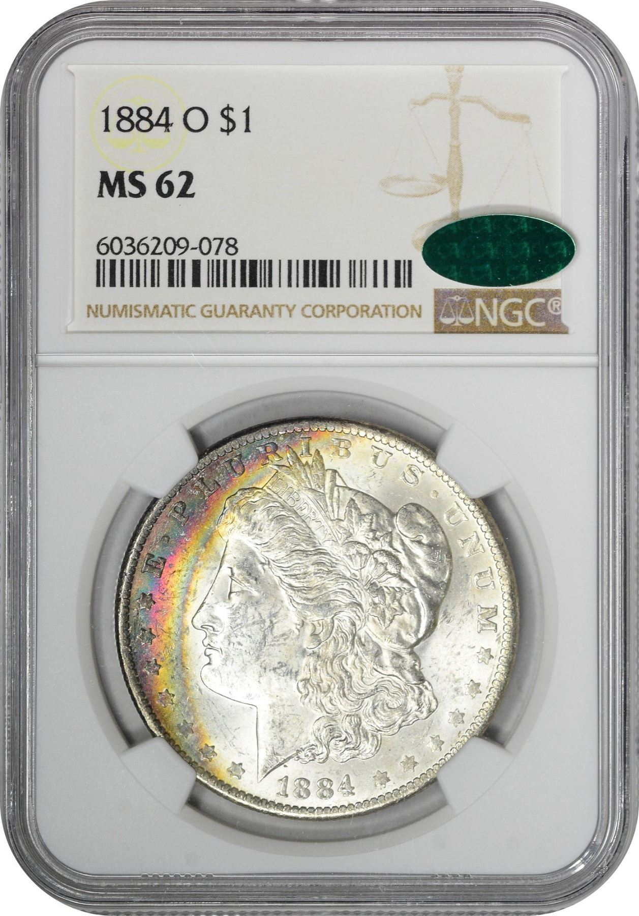 One 1884-O $1 Morgan Silver Dollar Coin NGC MS62 CAC Amazing Toning.