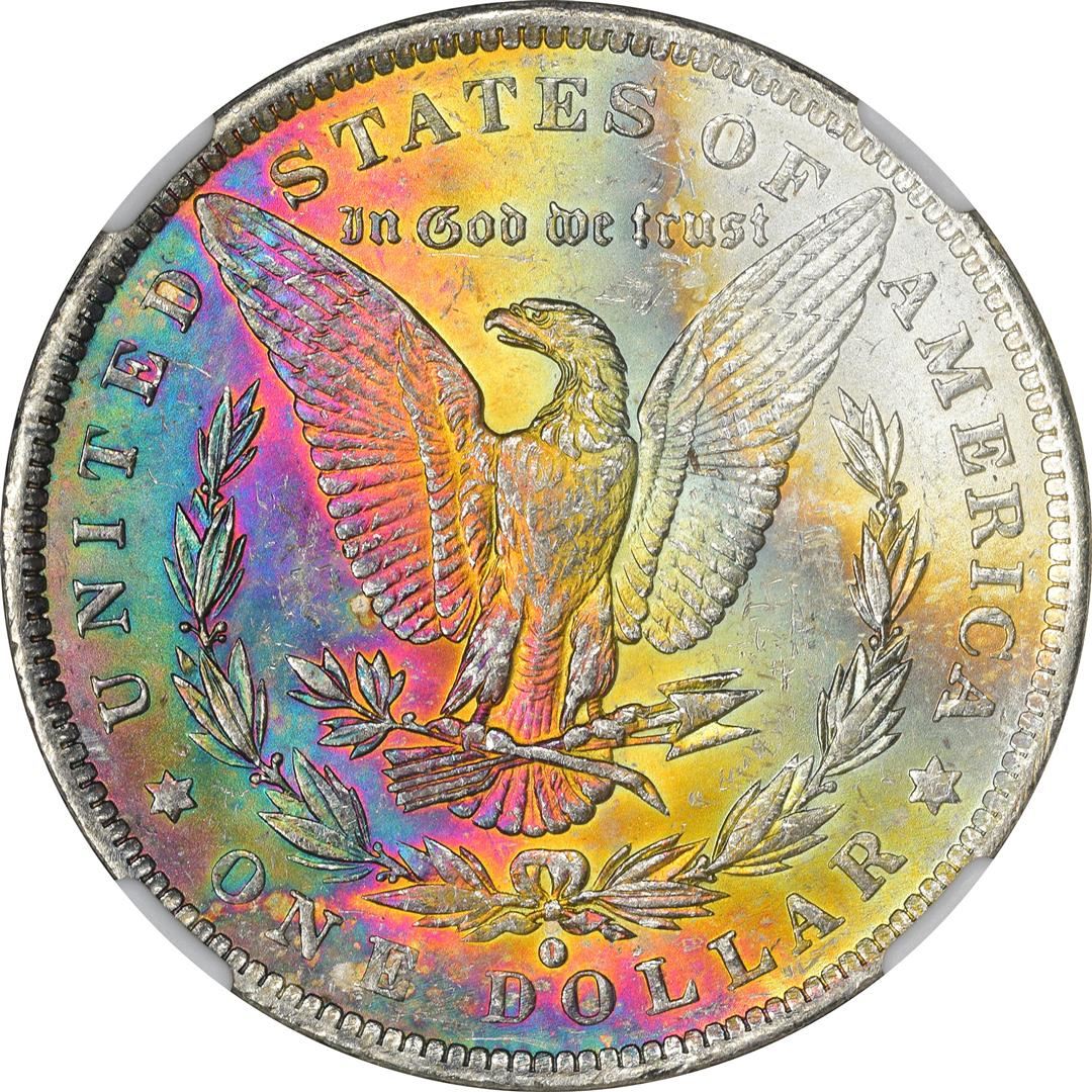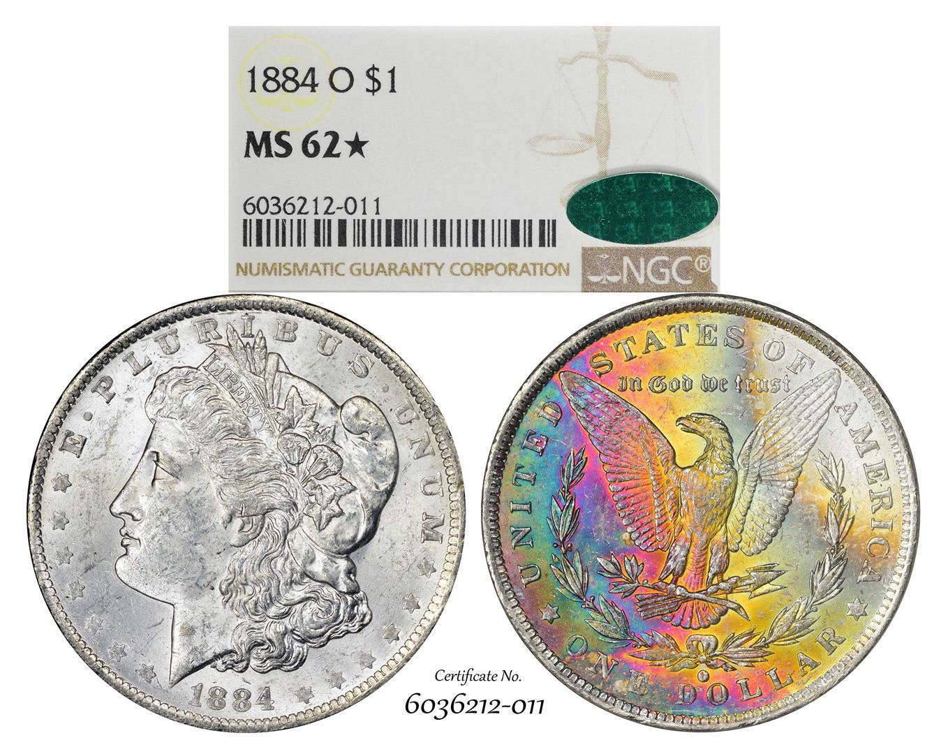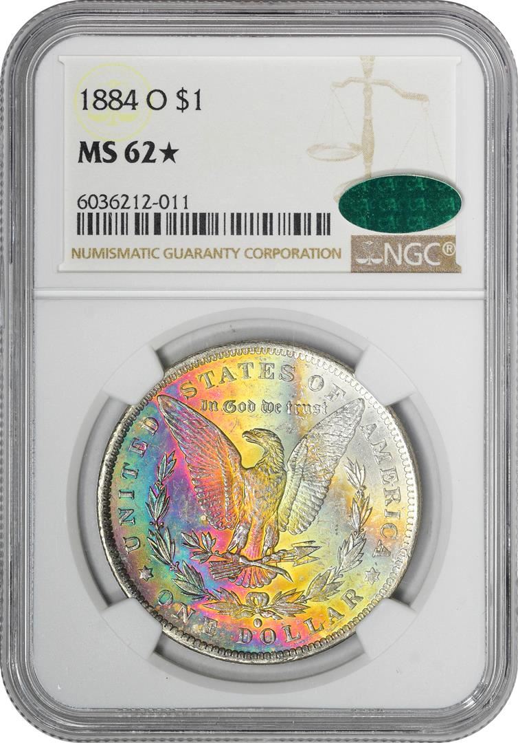 One 1884-O $1 Morgan Silver Dollar Coin NGC MS62* Star CAC Amazing Toning. NGC Certified.