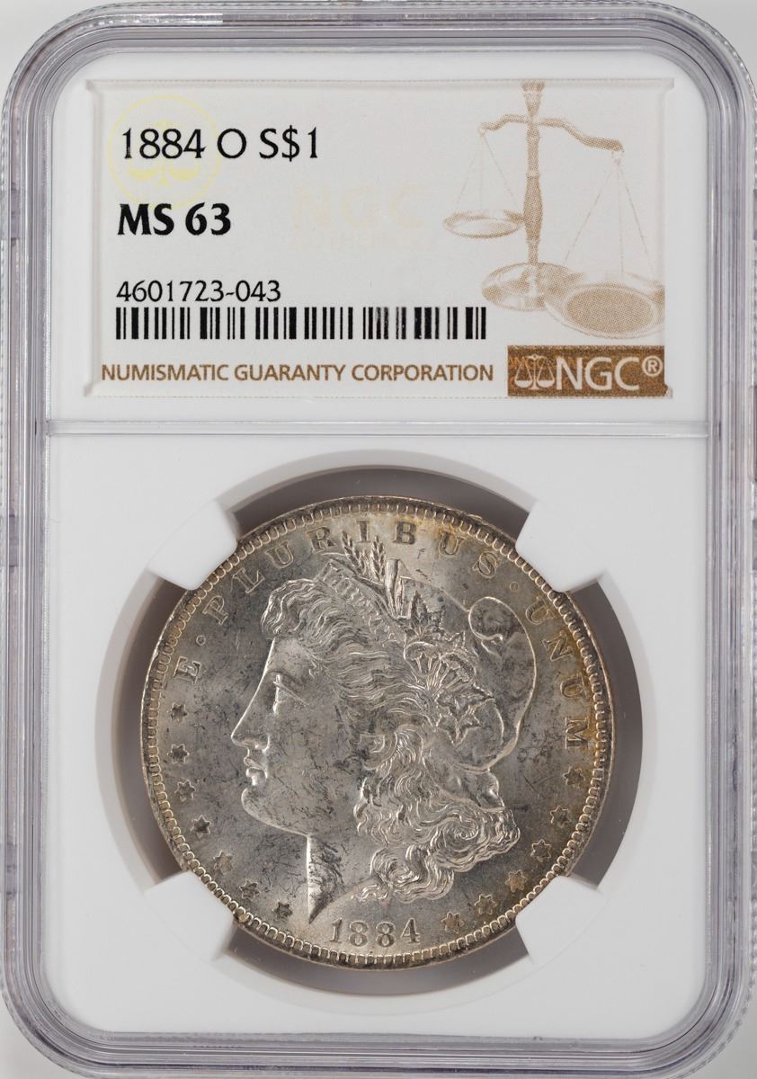 One 1884-O $1 Morgan Silver Dollar Coin NGC MS63.