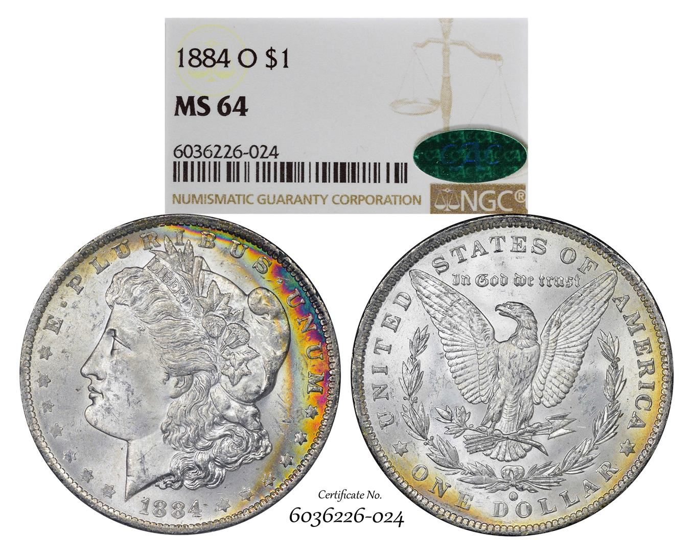 One 1884-O $1 Morgan Silver Dollar Coin NGC MS64 CAC Amazing Toning. NGC Certified.
