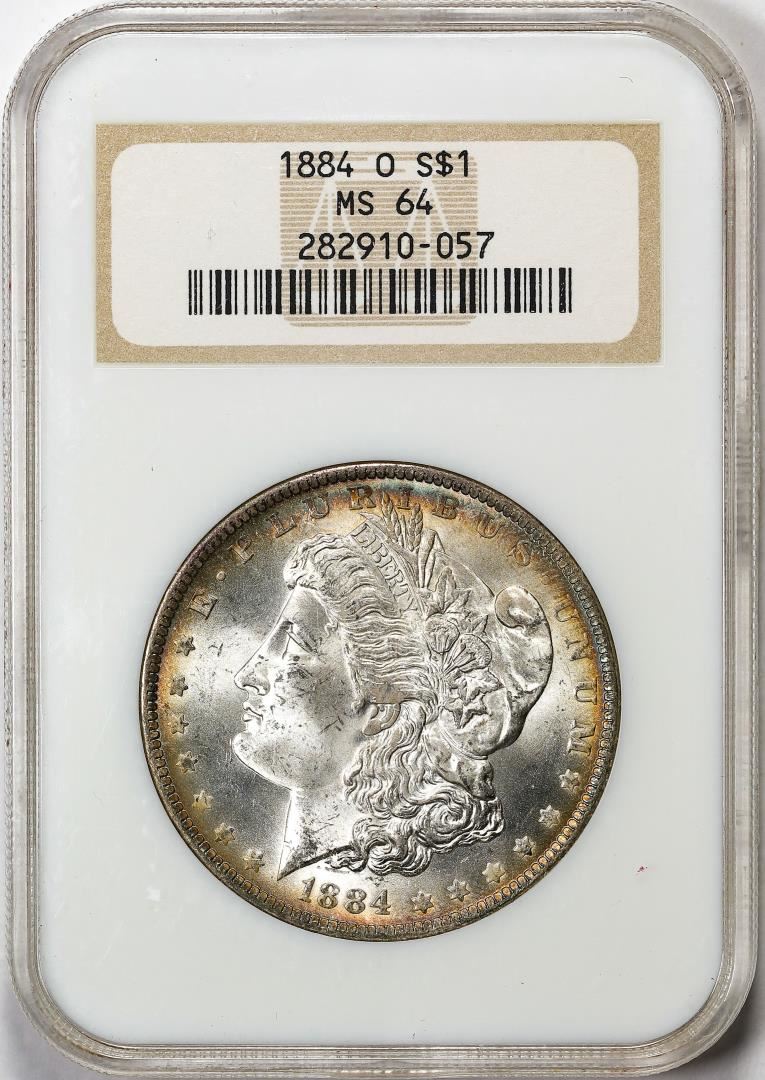 One 1884-O $1 Morgan Silver Dollar Coin NGC MS64 Nice Toning Old Fatty Holder. NGC Certified.